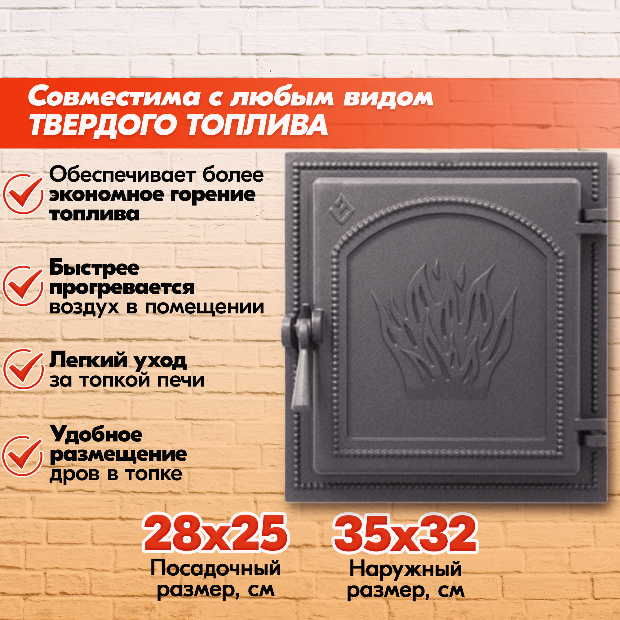 Наружный размер и посадочный размер для каждой печной дверки указан на изображениях в каждой карточке.