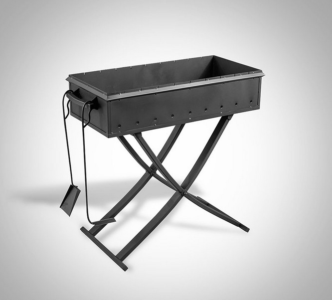 Небольшой удобный мангал со съемными опорами (ножками).  Заводского производства. При изготовлении применится жаропрочные и антикоррозийные материалы (сталь, эмаль), что обеспечивает отсутствие деформаций и длительные сроки службы.