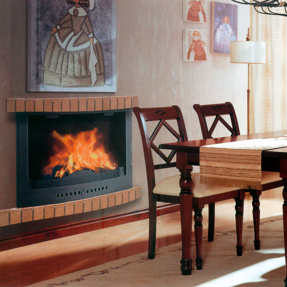 Стальной кожух каминной топки отстоит от корпуса на 3-4 сантиметра, что обеспечивает отличные конвекционные свойства теплового агрегата. Холодный воздух захватывается в щель снизу под дверью и, нагреваясь, выходит в верхней части боковых стенок кожуха. Таким образом обеспечивается быстрый прогрев помещения или объёма, расположенного под облицовкой камина.