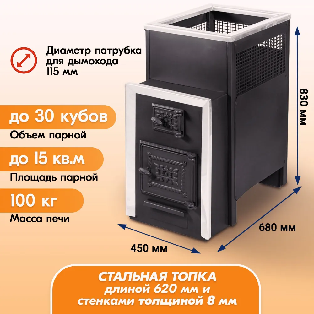 Дровяная банная печь Радуга ПБ-30Б мощностью 30 кВт подходит для парных объемом до 30 кубов (или до 15 кв. м при высоте потолка 2 м).