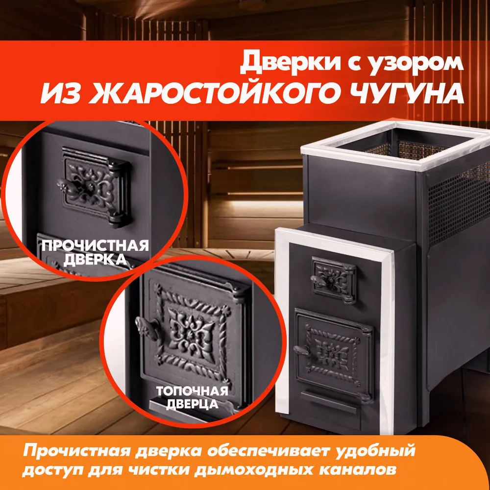 Благодаря наличию дверцы вы сможете самостоятельно прочистить дымоход при возникновении необходимости непосредственно из банного помещения.