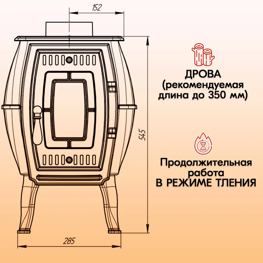 Объем топки составляет 30 литров. Рекомендуемая длина дров до 350 мм.