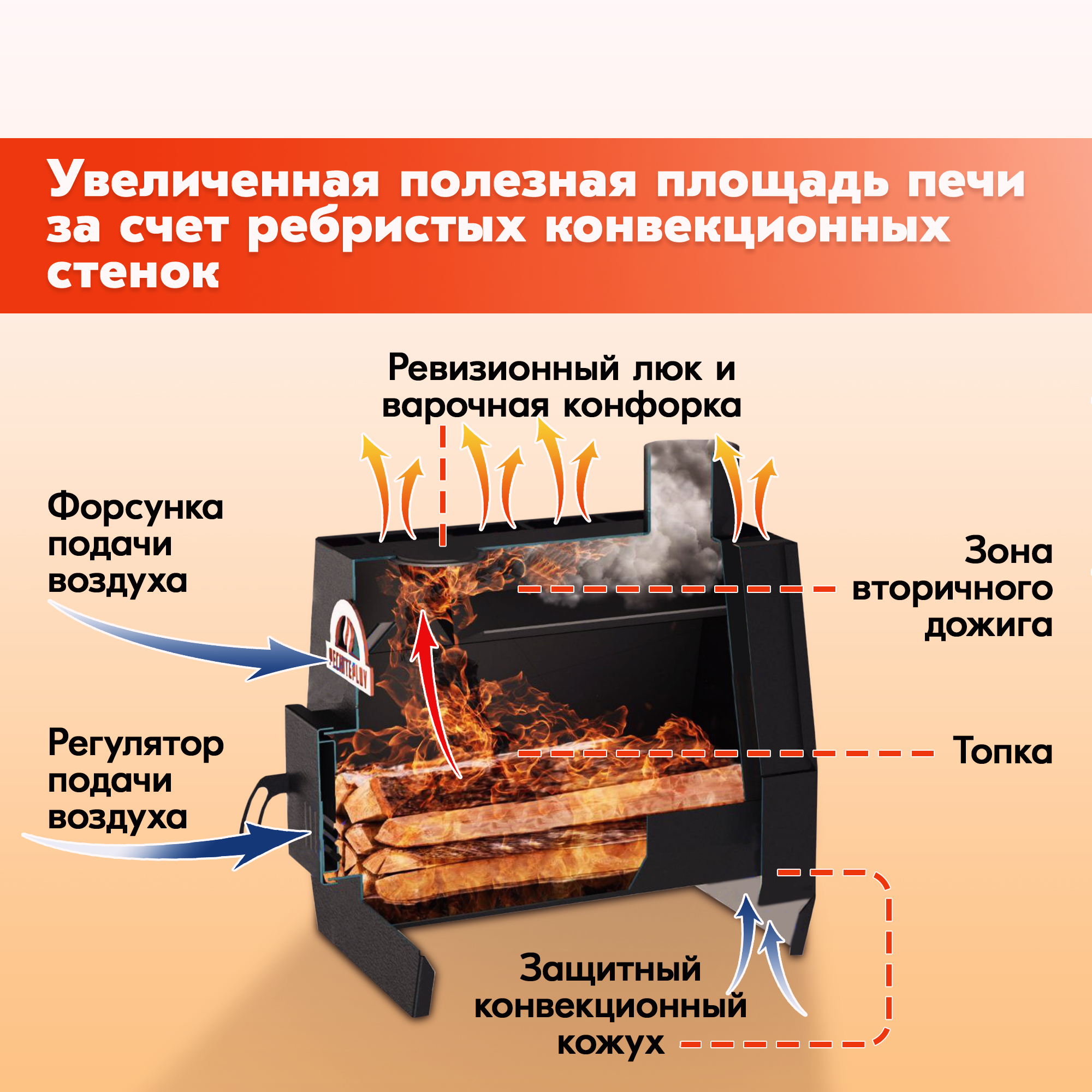 Боковые стенки - это конвекторы, которые увеличивают полезную площадь печи. Благодаря такой конструкции максимально эффективно прогревается окружающий воздух и создается циркуляция теплого потока в помещении.