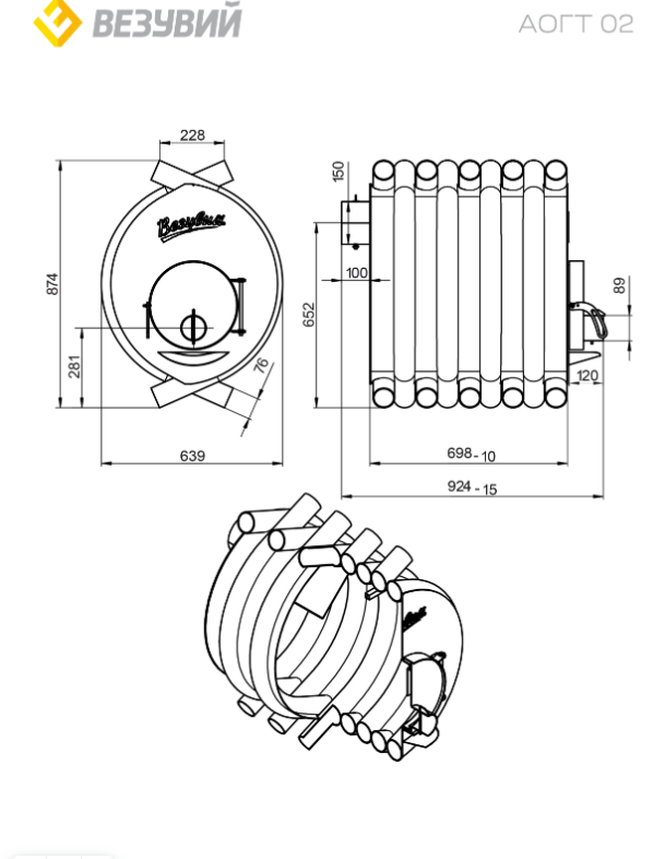 Печь отопительная ВЕЗУВИЙ АОГТ 02 С предназначена для обогрева бытовых нежилых и промышленных помещений. Печь рассчитана на обогрев помещений объёмом 400 кубических метров.
