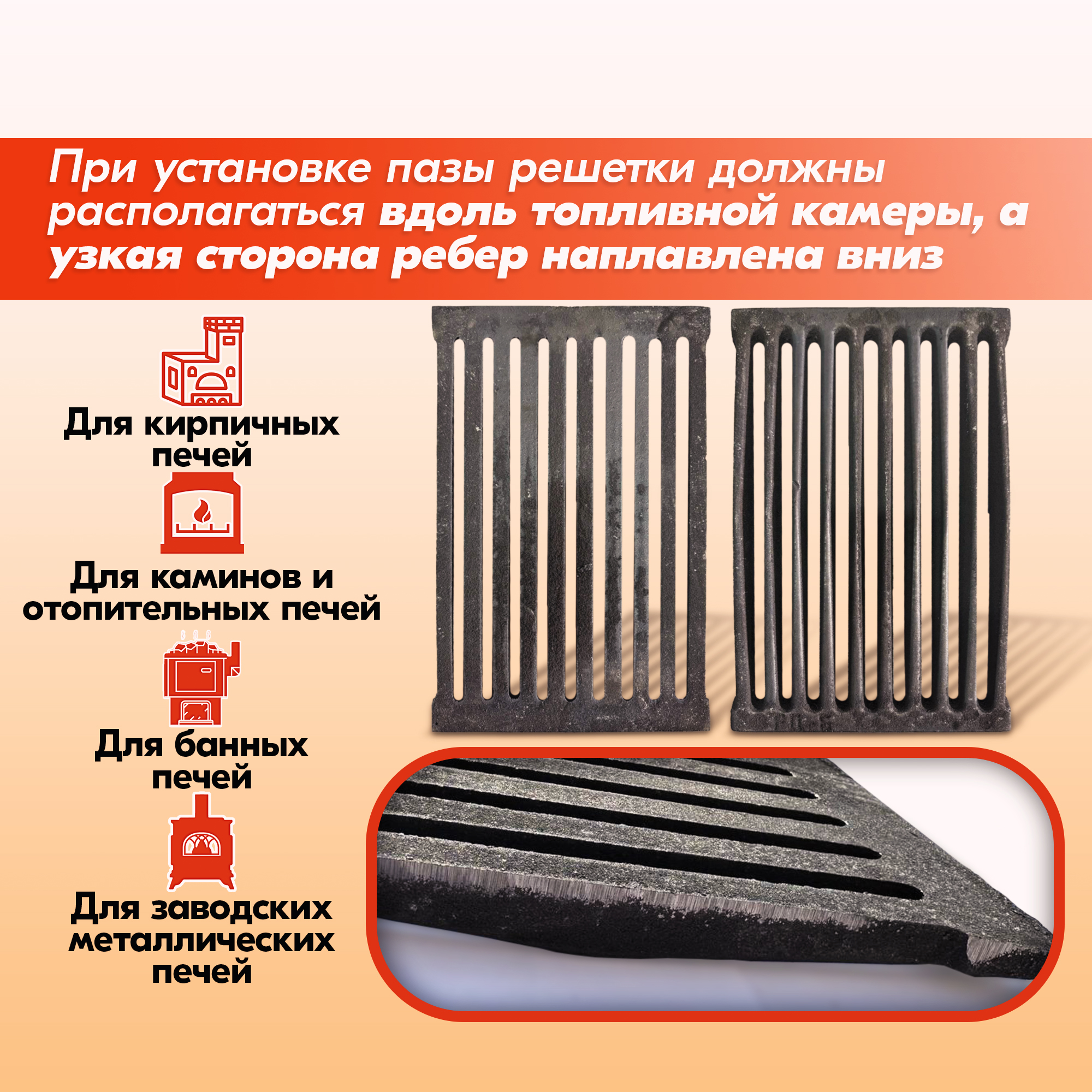 Обращаем внимание, что колосниковая решетка из чугуна РУ-7 — это 1/2 колосниковой решетки для угля РУ-2 и предназначена для укладки с решеткой РУ-2 в увеличенные по ширине топки печей размером 300х300 мм и больше.