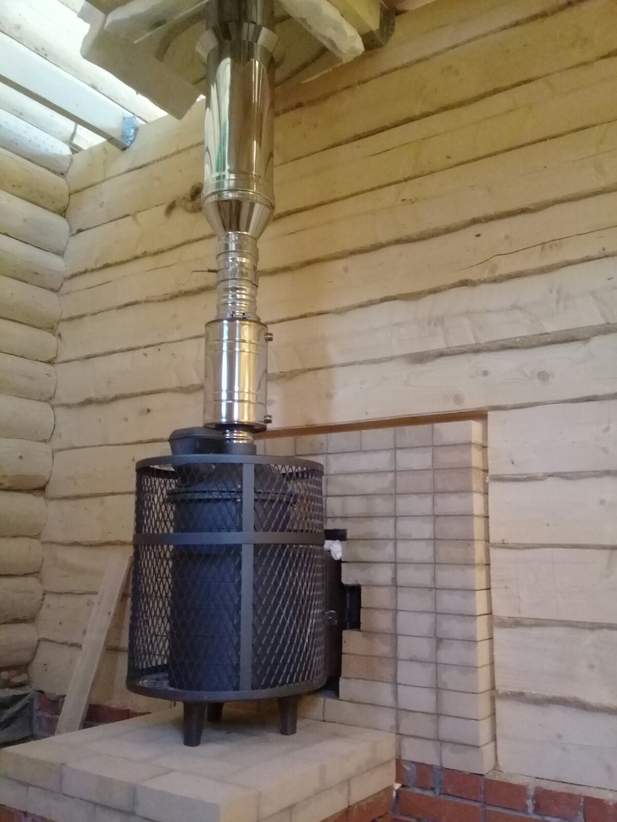 Монтаж печи Атмосфера с установкой коплекта дымохода и кирпичного портала.