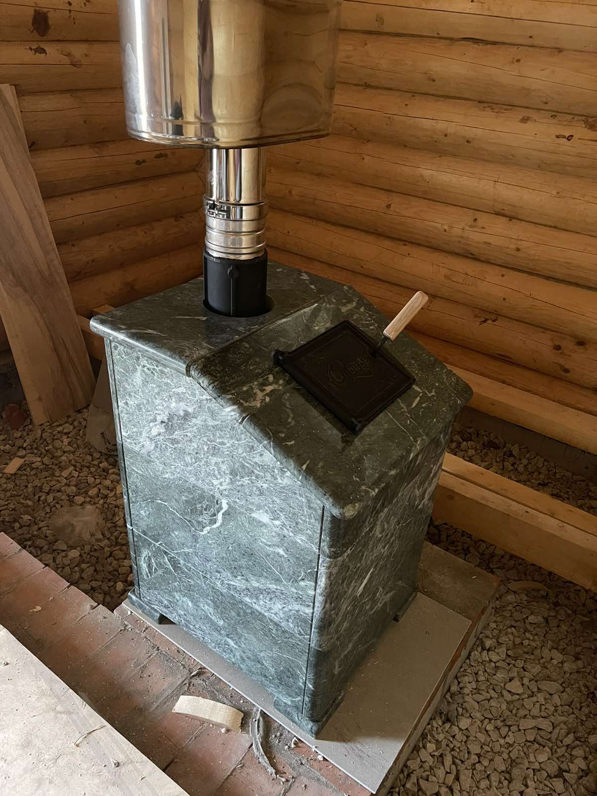 Монтаж Печь банная НМК Сибирь 25 с ЗК без ВТК в облицовке "Президент" змеевик (дверка без стекла), сборка облицовки, установка дымохода.